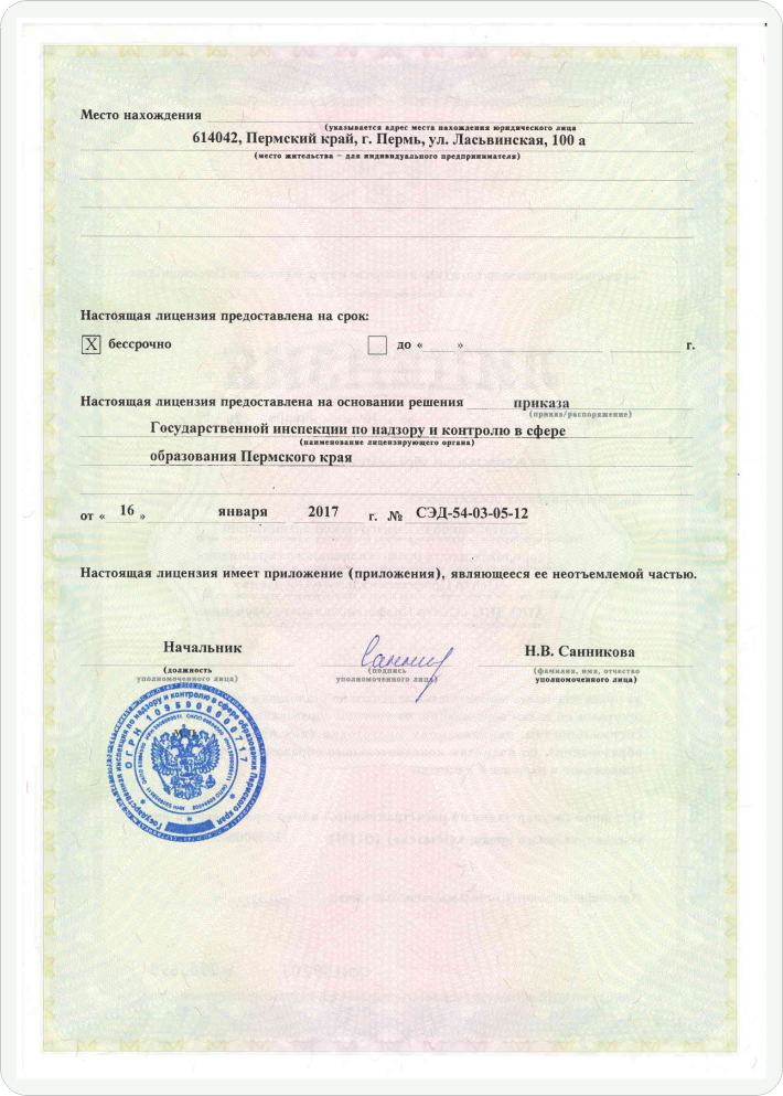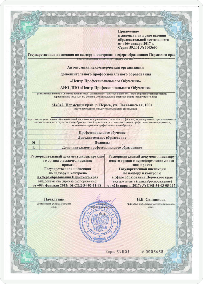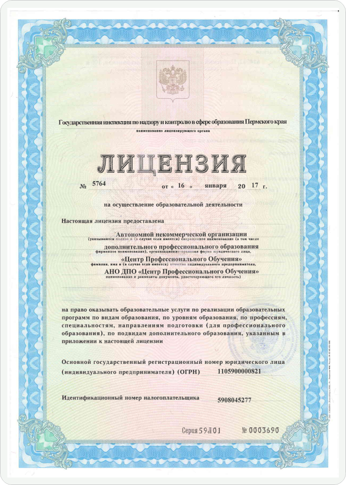 Лицензия на образовательную деятельность № 5764 от 16.01.2017 г.